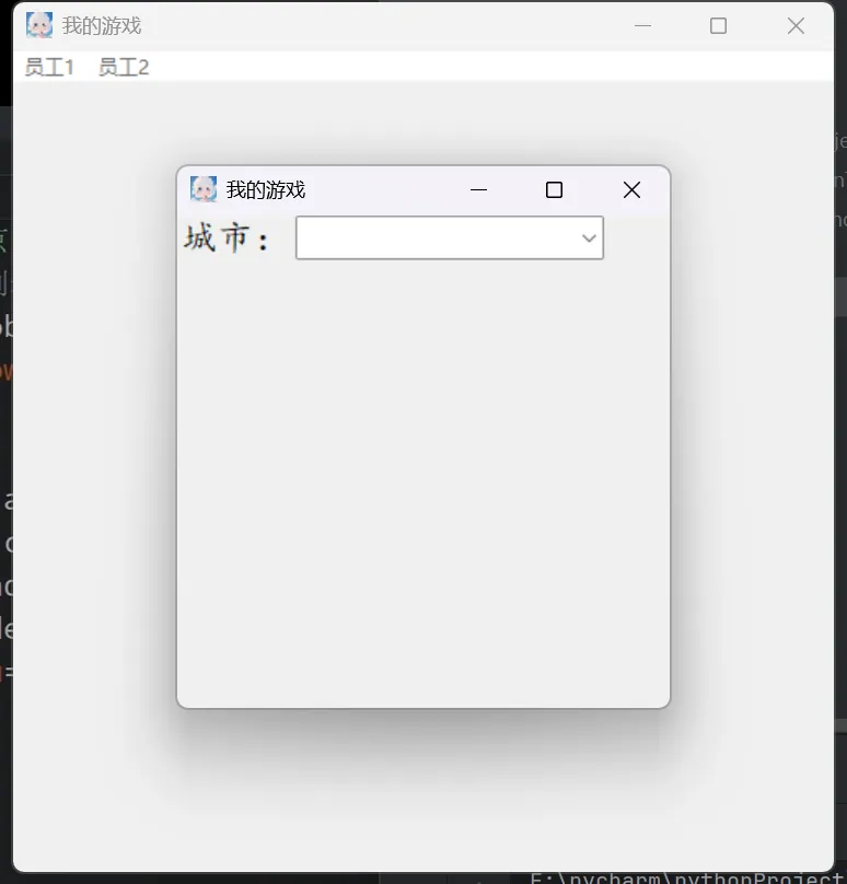 # 创建下拉列表(组合框)# 导包:from tkinter.ttk import Comboboximport tkinter as tkfrom tkinter.ttk import Comboboxa1 = tk.Tk()a1.title('我的游戏')a1.geometry('500x500+400+200')a1.resizable(True, True)a1.iconbitmap('logo1.ico')def t(): t1 = tk.Toplevel() t1.title('我的游戏') t1.geometry('300x300+500+300') t1.resizable(True, True) t1.iconbitmap('logo1.ico') tk.Label(t1, text='城市:', font=('楷体', 16)).grid(row=1, column=1) t2 = tk.StringVar() t3 = ['北京', '上海', '深圳', '广州'] # 创建下拉列表(组合框) t4 = Combobox(t1, state='readon +ly', width=15, textvariable=t2, values=t3, font=('楷体', 16)) t4.grid(row=1, column=2)# 创建主菜单cai = tk.Menu(a1)# 创建下级菜单xia = tk.Menu(cai, tearoff=0)# 设置下级菜单xia.add_command(label='添加', command=t)# 绑定到主菜单# 设置菜单名cai.add_cascade(label='员工1', menu=xia) # menu=xia下级菜单绑定到主菜单cai.add_cascade(label='员工2')# 开启菜单栏a1.config(menu=cai)a1.mainloop()