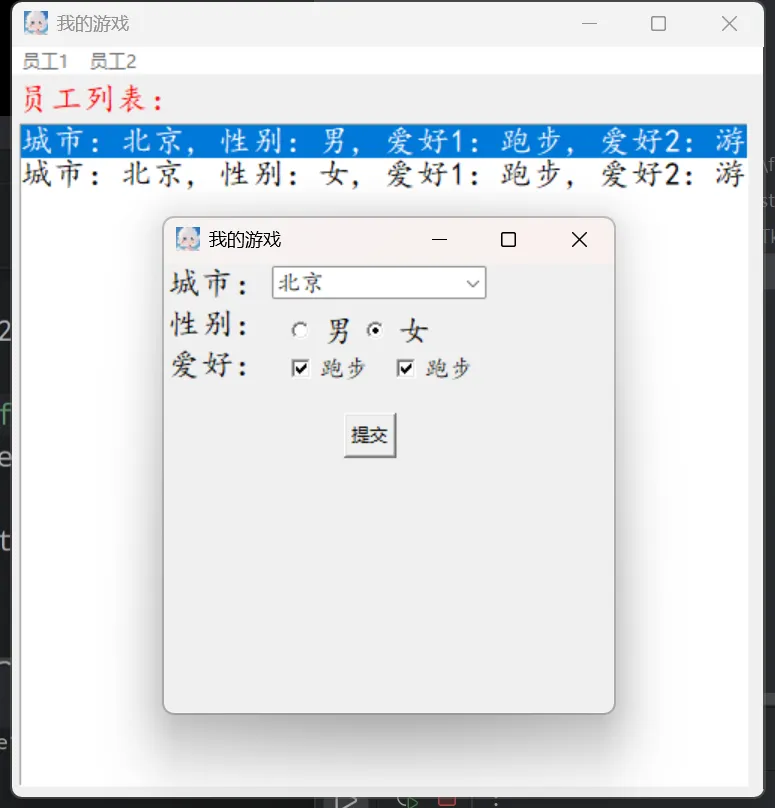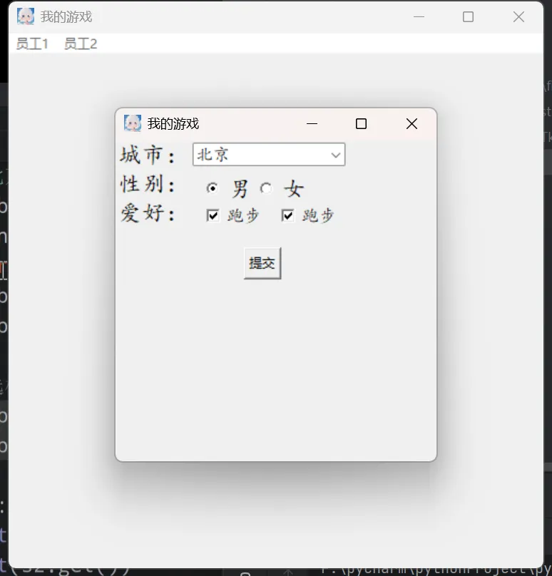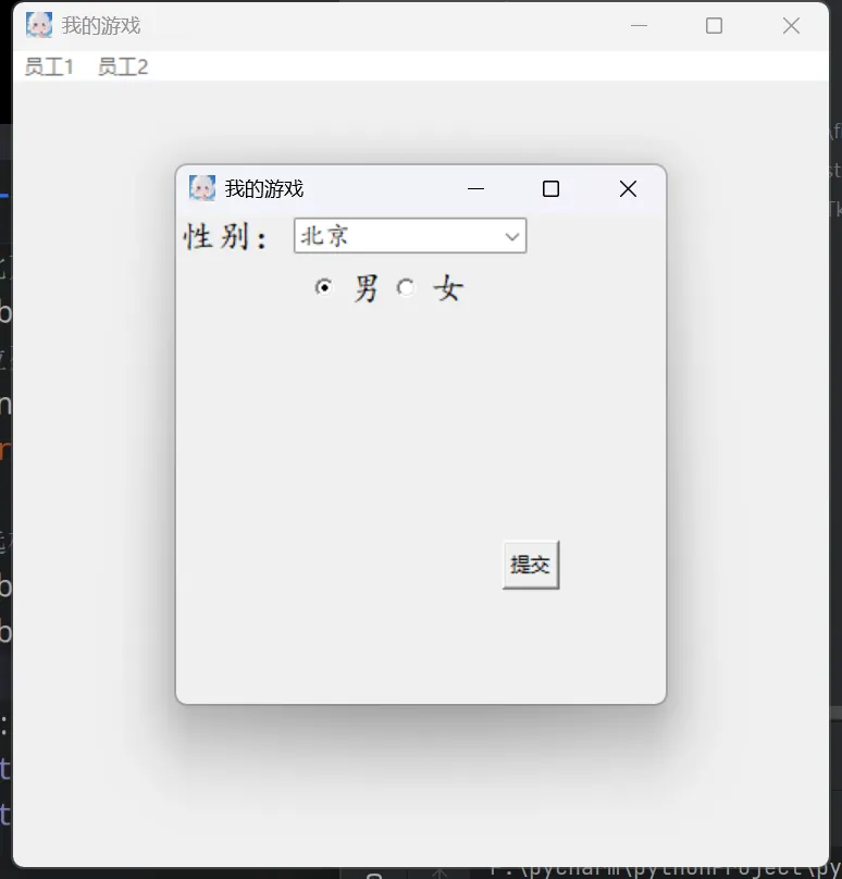 # 创建单选框# 顶层窗口焦点import tkinter as tkfrom tkinter.ttk import Comboboxa1 = tk.Tk()a1.title('我的游戏')a1.geometry('500x500+400+200')a1.resizable(True, True)a1.iconbitmap('logo1.ico')def t(): t1 = tk.Toplevel() t1.title('我的游戏') t1.geometry('300x300+500+300') t1.resizable(True, True) t1.iconbitmap('logo1.ico') # 设置顶层窗口焦点 t1.focus_set() tk.Label(t1, text='城市:', font=('楷体', 16)).grid(row=1, column=1) tk.Label(t1, text='性别:', font=('楷体', 16)).grid(row=1, column=1) t2 = tk.StringVar() s2 = tk.StringVar(value='男') t3 = ['北京', '上海', '深圳', '广州'] # 创建下拉列表(组合框) t4 = Combobox(t1, state='readonly', width=15, textvariable=t2, values=t3, font=('楷体', 12)) # 设置下拉列表组件默认显示列表内哪个下标索引 t4.current(0) t4.grid(row=1, column=2) # 创建单选框 tk.Radiobutton(t1, font=('楷体', 16), text='男', variable=s2, value='男').place(x=80, y=30) tk.Radiobutton(t1, font=('楷体', 16), text='女', variable=s2, value='女').place(x=130, y=30) def tj(): print(t2.get()) print(s2.get()) tk.Button(t1, text='提交', command=tj).place(x=200, y=200)# 创建主菜单cai = tk.Menu(a1)# 创建下级菜单xia = tk.Menu(cai, tearoff=0)# 设置下级菜单xia.add_command(label='添加', command=t)# 绑定到主菜单# 设置菜单名cai.add_cascade(label='员工1', menu=xia) # menu=xia下级菜单绑定到主菜单cai.add_cascade(label='员工2')# 开启菜单栏a1.config(menu=cai)a1.mainloop()