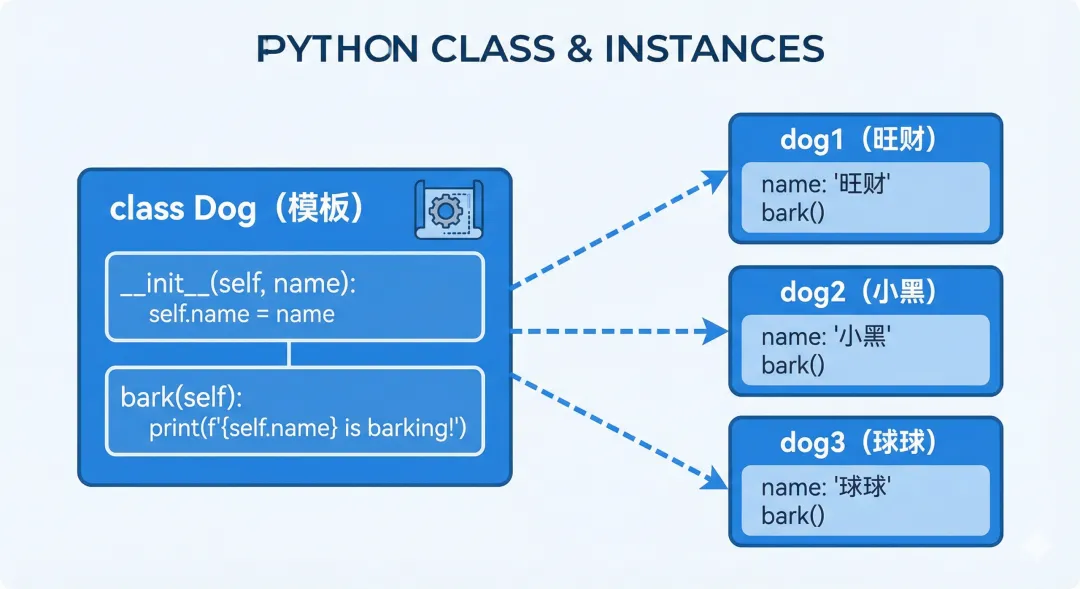 class Dog: def __init__(self, name): self.name = name # self.name 是实例属性 def bark(self): print(f"{self.name} 说:汪汪!") # 通过 self 访问实例属性dog = Dog("旺财")dog.bark() # 旺财 说:汪汪!