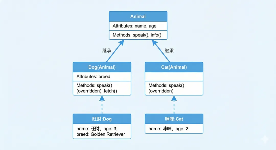 dog = Dog("旺财", 3, "金毛")dog.speak() # 旺财 说:汪汪!(覆盖了父类方法)dog.info() # 姓名:旺财,年龄:3(继承自父类)dog.fetch() # 旺财 去捡球了!cat = Cat("咪咪", 2)cat.speak() # 咪咪 说:喵喵!# 检查继承关系print(isinstance(dog, Dog)) # Trueprint(isinstance(dog, Animal)) # True(也是 Animal 的实例)print(issubclass(Dog, Animal)) # True