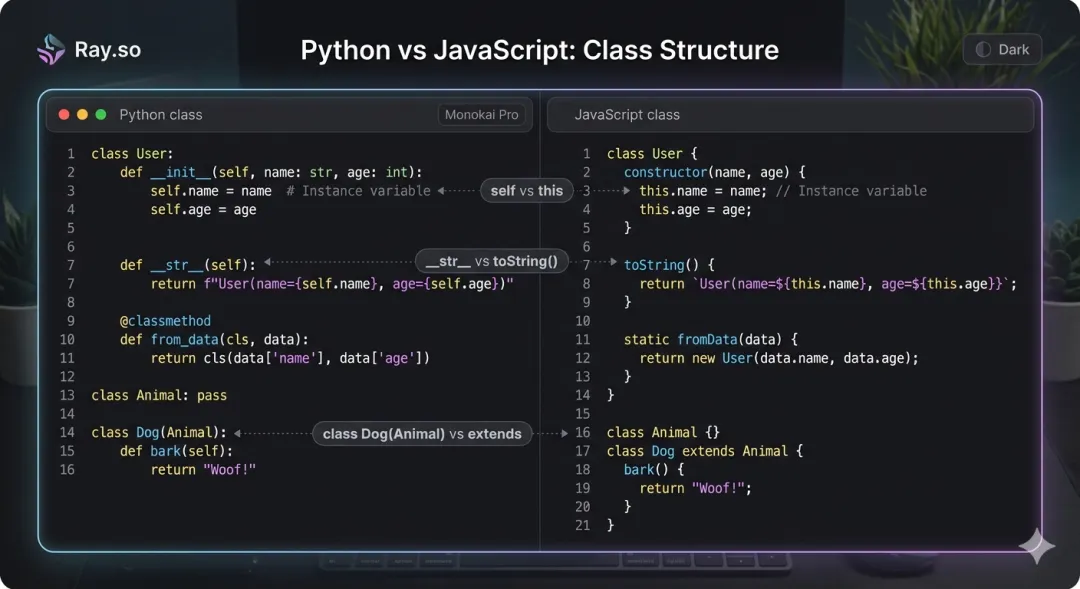 继承语法对比:Python 用 class Dog(Animal),JS 用 class Dog extends Animal,其余几乎相同。