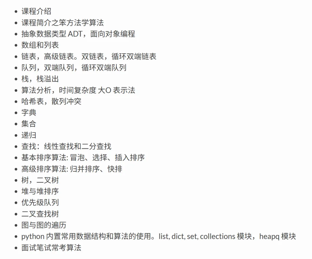 今天给大家推荐一份优质的开源数据结构与算法教程(作者:PegasusWang),这份教程以 Python 为载体,内容体系清晰,非常适合入门学习。作为教程的入门内容,难度较低,核心是帮大家巩固 Python 编程语言基础,同时理解抽象数据类型的核心概念,为后续学习打下基础。这是教程的核心模块,重点掌握各类数据结构的存储逻辑、操作方式和适用场景:
