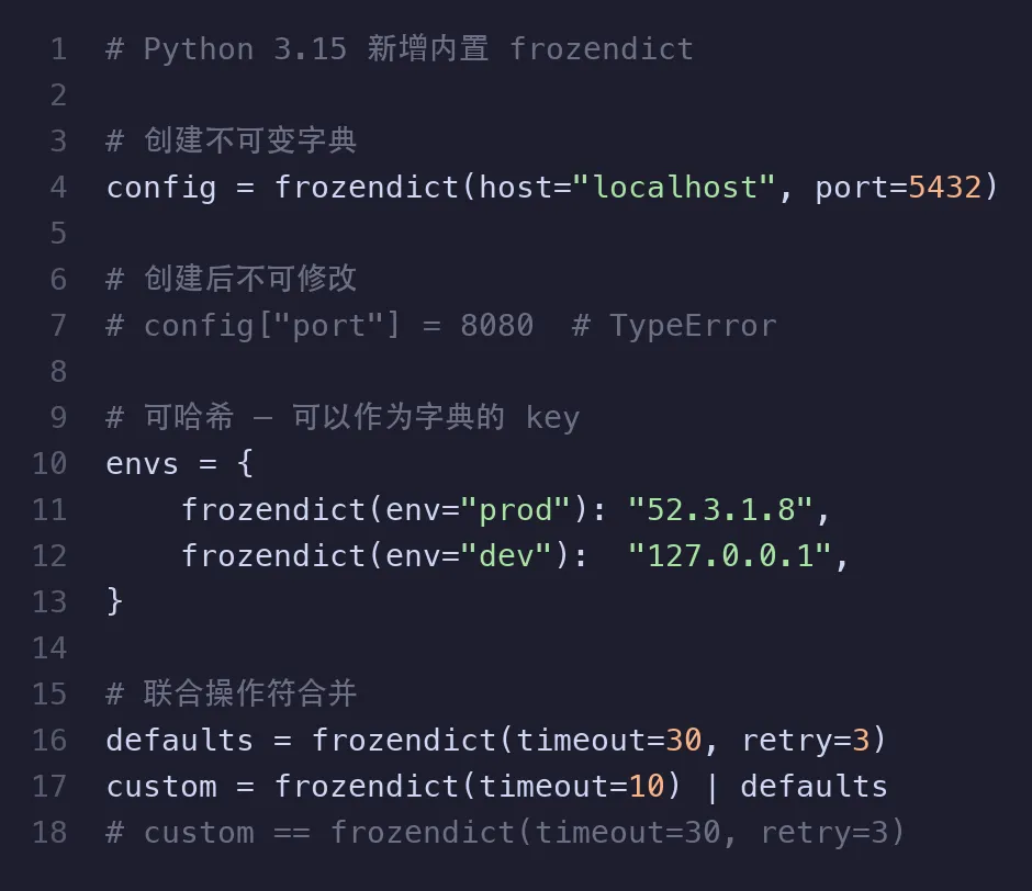 Python 3.15 还在开发中,最终 API 可能调整。但方向已经明确了。如果你现在的代码里有用 tuple 伪装字典、用 MappingProxyType 包裹配置、或者装了第三方 frozendict 库的场景,可以开始准备迁移了。