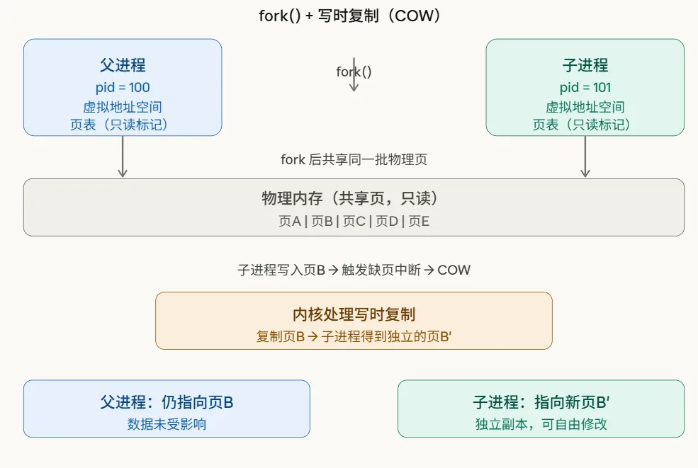 fork() 之后,父子进程共享同一批物理页,页表项都标记为只读。谁先写,才触发缺页中断,内核只复制那一页。