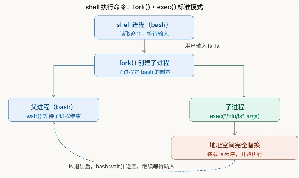 这就是为什么你在 shell 里输入 ls,执行的是 /bin/ls 而不是 bash 自己——bash fork() 出一个子进程,子进程 exec() 把自己替换成 ls,执行完退出,bash 继续等你输入下一条命令。