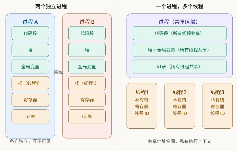 图中清晰展示了关键差异:进程间完全隔离,各自拥有独立的代码、堆、栈和文件描述符表。而同一进程内的多个线程,共享代码段、堆、全局变量和 fd 表,每个线程只有自己的栈、寄存器和线程 ID 是私有的。