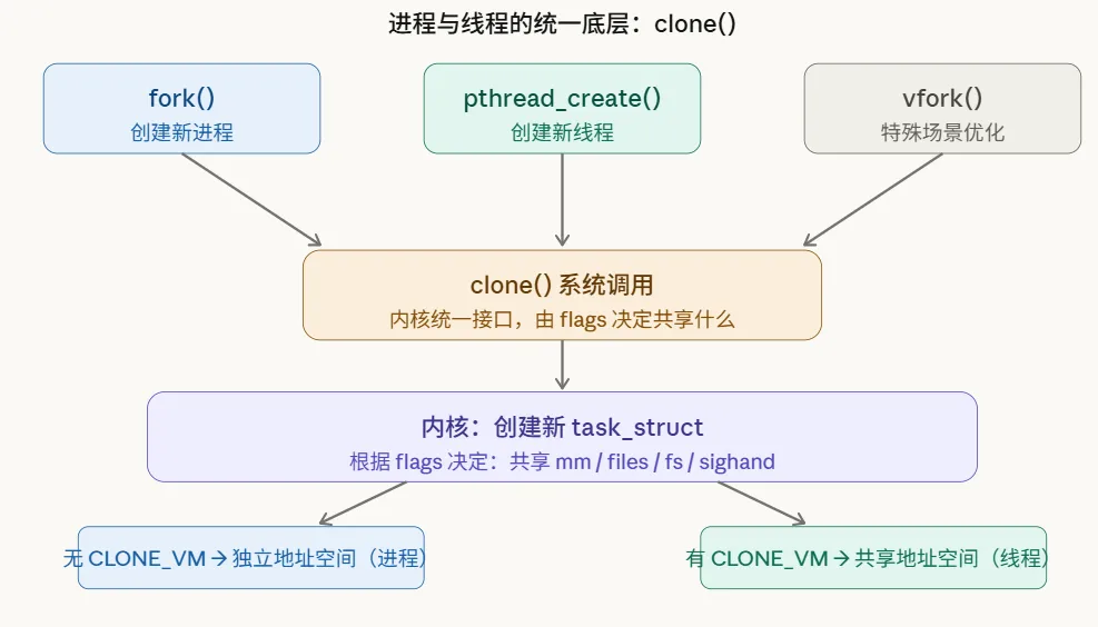 Linux 创建线程和创建进程用的是同一个底层系统调用——clone()。区别只在于传入的标志位:
