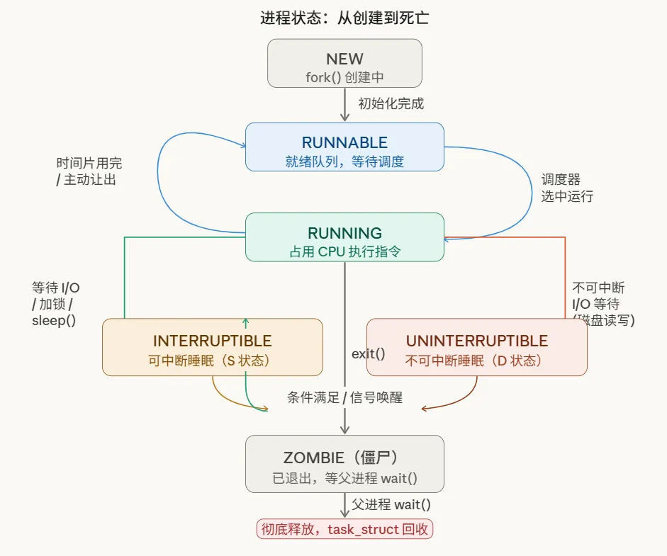 RUNNABLE ⇄ RUNNING 是高频切换的双向循环,由调度器控制INTERRUPTIBLE(S 状态)是最常见的睡眠状态,ps 看到的绝大多数进程都在这里,可以被信号唤醒UNINTERRUPTIBLE(D 状态)是等待不可中断 I/O 时进入,kill -9 都杀不掉,NFS 挂起导致的进程卡死就是这个状态ZOMBIE 是已死未葬,ps 显示为 Z,不占内存但占 PID僵尸进程(Zombie) 是个常见话题:子进程退出后,task_struct 不会立刻释放,需要等父进程调用 wait() 收集退出状态,才会真正消失。如果父进程一直不 wait(),僵尸进程会堆积,占用 PID 资源(虽然不占内存)。