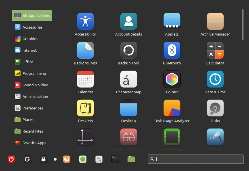 这个菜单是 Mint 最强大的入口:它不仅仅是启动器,还集成了应用搜索、文件搜索、设置快速跳转、计算器、网页搜索等功能。你可以直接敲入“firefox”打开浏览器、“terminal”打开终端、“设置”直达系统偏好,甚至搜索桌面上的文档或最近文件。