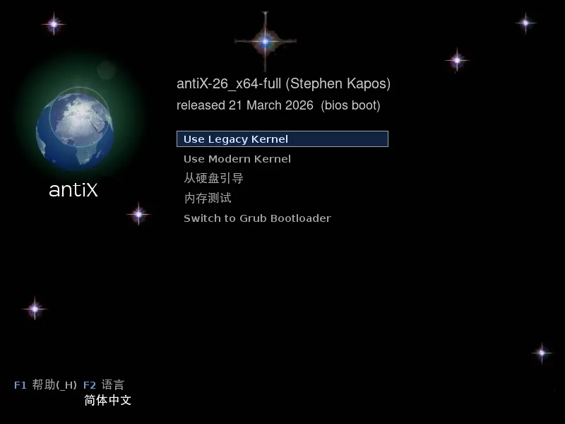 在系统底层方面,antiX 26 提供了多种内核选择。64 位版本默认使用 Linux 6.6 LTS,同时也提供更稳定的 5.10 LTS 作为备用;32 位版本则采用 5.10 LTS。在 64 位系统中,这两个内核都可以在启动时自由选择。