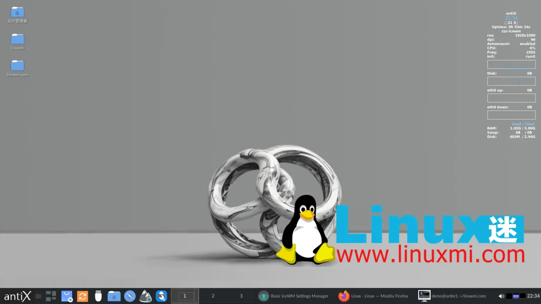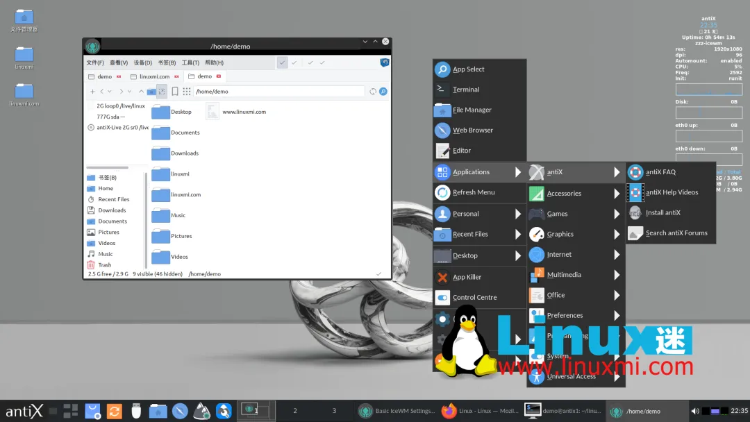 默认使用 IceWM,同时还提供 Fluxbox、JWM 以及平铺式的 herbstluftwm。这种方案可以显著降低系统资源占用,让老旧电脑也能流畅运行,同时也更符合追求效率的用户需求。