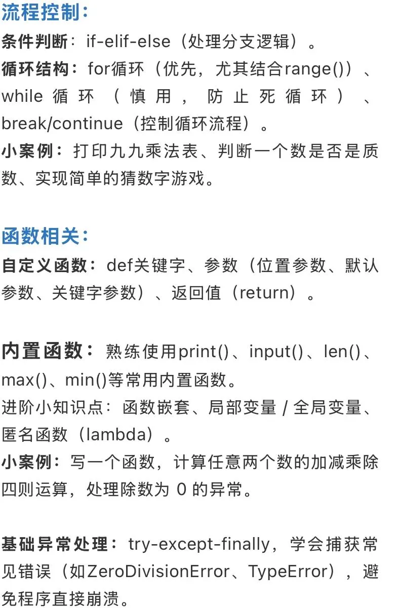 基础异常处理:try-except-finally,学会捕获常见错误(如ZeroDivisionError、TypeError),避免程序直接崩溃。