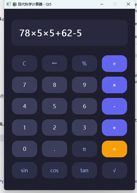 import sysfrom PyQt5.QtWidgets import *from PyQt5.QtCore import *from PyQt5.QtGui import *import mathclassCalculator(QMainWindow):def__init__(self):        super().__init__()        self.setWindowTitle("🧮 现代计算器")        self.setFixedSize(420580)        self.setStyleSheet(self.get_style())        self.init_ui()defget_style(self):return"""        QMainWindow {            background-color: #1E1E2E;        }        QLineEdit {            background-color: #28293E;            color: #FFFFFF;            border: none;            border-radius: 16px;            padding: 20px;            font-size: 28px;        }        QPushButton {            border: none;            border-radius: 18px;            font-size: 16px;            color: #FFFFFF;            padding: 14px;        }        QPushButton#num {            background-color: #3B3D5B;        }        QPushButton#num:hover {            background-color: #4D4F72;        }        QPushButton#opt {            background-color: #6366F1;            color: white;        }        QPushButton#opt:hover {            background-color: #7C7DFF;        }        QPushButton#func {            background-color: #2D2F48;            color: #A5B3FF;        }        QPushButton#func:hover {            background-color: #3E405D;        }        QPushButton#equal {            background-color: #F59E0B;            color: white;        }        QPushButton#equal:hover {            background-color: #FFB830;        }        """definit_ui(self):        central = QWidget()        self.setCentralWidget(central)        main_layout = QVBoxLayout(central)        main_layout.setContentsMargins(24242424)        main_layout.setSpacing(16)# 显示框        self.display = QLineEdit()        self.display.setAlignment(Qt.AlignRight)        self.display.setMinimumHeight(80)        main_layout.addWidget(self.display)# 按钮网格        grid = QGridLayout()        grid.setSpacing(12)        buttons = [            ("C""func"), ("←""func"), ("%""func"), ("÷""opt"),            ("7""num"), ("8""num"), ("9""num"), ("×""opt"),            ("4""num"), ("5""num"), ("6""num"), ("-""opt"),            ("1""num"), ("2""num"), ("3""num"), ("+""opt"),            ("0""num"), (".""num"), ("π""func"), ("=""equal"),            ("sin""func"), ("cos""func"), ("tan""func"), ("√""func"),        ]        positions = [(i, j) for i in range(6for j in range(4)]for i, ((text, cls), pos) in enumerate(zip(buttons, positions)):            btn = QPushButton(text)            btn.setObjectName(cls)            btn.clicked.connect(lambda checked, t=text: self.on_btn_click(t))            grid.addWidget(btn, *pos)        main_layout.addLayout(grid)defon_btn_click(self, t):        current = self.display.text()if t == "C":            self.display.clear()elif t == "←":            self.display.setText(current[:-1])elif t == "=":try:                exp = current.replace("÷""/").replace("×""*")                res = eval(exp)                self.display.setText(str(round(res, 10)))except:                self.display.setText("错误")elif t == "π":            self.display.setText(current + str(math.pi))elif t == "√":try:                res = math.sqrt(float(current))                self.display.setText(str(round(res, 10)))except:                self.display.setText("错误")elif t == "sin":try:                res = math.sin(math.radians(float(current)))                self.display.setText(str(round(res, 10)))except:                self.display.setText("错误")elif t == "cos":try:                res = math.cos(math.radians(float(current)))                self.display.setText(str(round(res, 10)))except:                self.display.setText("错误")elif t == "tan":try:                res = math.tan(math.radians(float(current)))                self.display.setText(str(round(res, 10)))except:                self.display.setText("错误")else:            self.display.setText(current + t)if __name__ == "__main__":    app = QApplication(sys.argv)    win = Calculator()    win.show()    sys.exit(app.exec_())