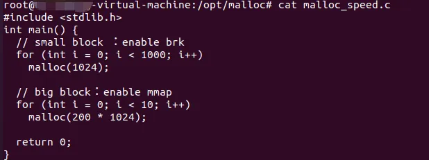 在程序中调用 malloc 函数时,它会首先在 glibc 维护的内存池中查找是否有足够的空闲内存来满足请求。如果内存池中有足够的空闲内存,malloc 函数会直接从内存池中分配内存,并返回相应的指针。如果内存池中的空闲内存不足以满足,malloc 函数就会借助系统调用与操作系统进行交互,如上述:brk和mmap 。brk系统调用通过移动程序数据段的结束地址来增加堆的大小,从而分配新的内存。而mmap系统调用则是通过在文件映射区域分配一块内存来满足请求。一般来说,小于128KB的时候,就会用brk ; 大于128KB时候,就用mmap系统调用;我们写一个程序,来测试一下brk和mmap的调用情况:编译:gcc malloc_speed.c -o malloc_speed