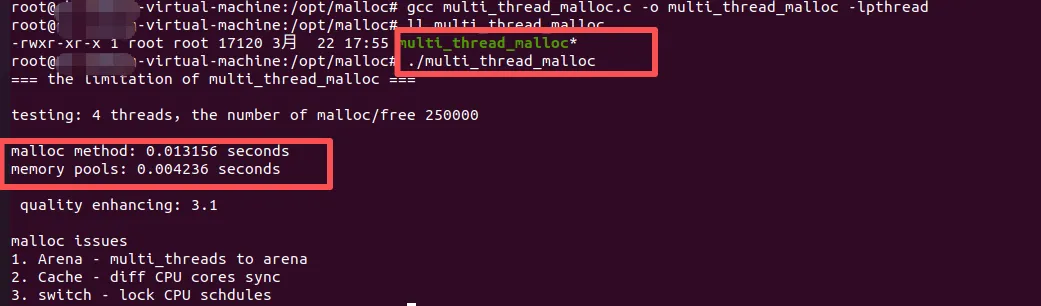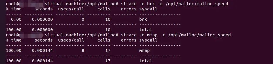然后采用strace命令 计算brk和mmap结果,并对比;通过上述结果,大家可以看到,小块主要用brk 进行堆增长,大块用mmap, mmap的系统调用明显有延迟(查看seconds等指标);#include<stdio.h>#include<stdlib.h>#include<pthread.h>#include<time.h>#define THREADS 4#define PER_THREAD 250000// malloc void* thread_malloc(void* arg){ for (int i = 0; i < PER_THREAD; i++) { void *ptr = malloc(64); free(ptr); } return NULL;}// memory pooltypedef struct { char pool[64 * 1000];} ThreadPool;void* thread_pool(void* arg){ ThreadPool *pool = (ThreadPool*)arg; for (int i = 0; i < PER_THREAD; i++) { char *ptr = &pool->pool[(i % 1000) * 64]; *ptr = 1; } return NULL;}intmain(){ pthread_t threads[THREADS]; struct timespec start, end; printf("=== the limitation of multi_thread_malloc ===\n\n"); printf("testing: %d threads,the number of malloc/free %d \n\n", THREADS, PER_THREAD); // malloc testing clock_gettime(CLOCK_MONOTONIC, &start); for (int i = 0; i < THREADS; i++) { pthread_create(&threads[i], NULL, thread_malloc, NULL); } for (int i = 0; i < THREADS; i++) { pthread_join(threads[i], NULL); } clock_gettime(CLOCK_MONOTONIC, &end); double malloc_time = (end.tv_sec - start.tv_sec) + (end.tv_nsec - start.tv_nsec) / 1e9; ThreadPool pools[THREADS]; clock_gettime(CLOCK_MONOTONIC, &start); for (int i = 0; i < THREADS; i++) { pthread_create(&threads[i], NULL, thread_pool, &pools[i]); } for (int i = 0; i < THREADS; i++) { pthread_join(threads[i], NULL); } clock_gettime(CLOCK_MONOTONIC, &end); double pool_time = (end.tv_sec - start.tv_sec) + (end.tv_nsec - start.tv_nsec) / 1e9; printf("malloc method: %.6f seconds\n", malloc_time); printf("memory pools: %.6f seconds\n", pool_time); printf("\n quality enhancing: %.1f\n\n", malloc_time / pool_time); printf("malloc issues \n"); printf("1. Arena - multi_threads to arena\n"); printf("2. Cache - diff CPU cores sync \n"); printf("3. switch - lock CPU schdules \n"); return 0;}