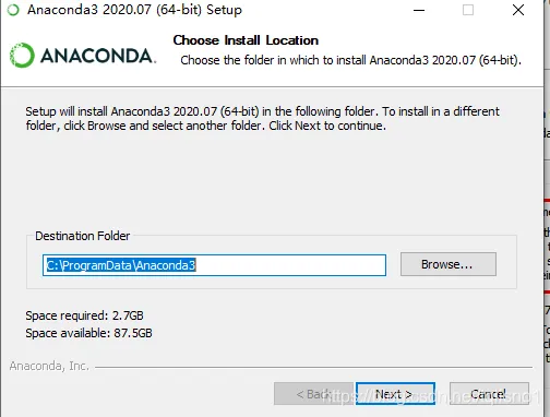 接下来选择安装路径,这里不建议装在C盘,安装完大概3个G左右,现在都是固态硬盘了,安装到固态硬盘就好,路径要知道自己安到了哪里(后续使用不同环境的时候会用到这个安装路径)。选择好了之后点击Next