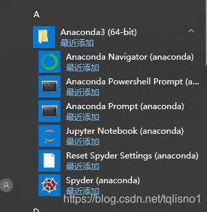 安装完成后在开始菜单会多出一个快捷方式,也就是Anaconda下的子程序: