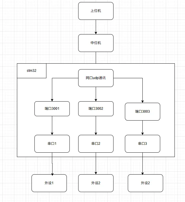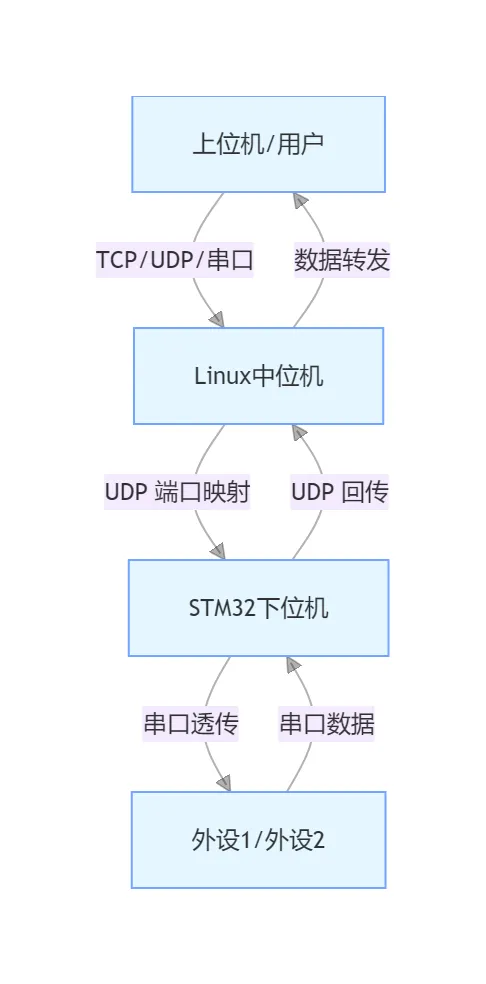 大家好,我是王鸽,之前文章stm32 UDP 串口透传方案,当中位机是 Linux 系统时,对接 STM32 下位机的 UDP 串口透传方案,核心是在 Linux 上编写UDP 服务端 / 客户端程序,实现与下位机的双向通信,并把串口透传的逻辑映射到 Linux 的网络 / 串口操作上,这篇文章主要是讲中位机这块怎么对接stm32。Linux 中位机通过 UDP 与 STM32 通信,端口号一一对应串口(如 3001→串口 1、3002→串口 2);- Linux→STM32:Linux 发送 UDP 包到 STM32 的对应端口,STM32 转发到串口;