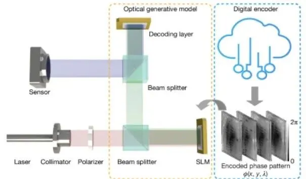 光学生成模型示意图。基于随机高斯噪声的输入首先通过浅层数字编码器进行处理,生成大量光学生成种子,由空间光调制器随机调用。输入光场经可重构且经过优化的衍射解码器传播后,生成的图像被记录在传感器阵列上。针对给定的目标数据分布,该光学生成模型可合成海量图像。输入光经衍射解码器传播以生成输出图像的光学过程耗时<1 ns;然而,图像生成的总体速度受限于输入空间光调制器的刷新时间。光学生成模型通过已学习的去噪扩散概率模型进行训练,利用去噪扩散概率模型生成的数据对来指导即时光学生成模型的优化。对于图像的推理,预先计算好的光学生成种子通过(例如)云服务器随机调用,而图像生成则通过自由空间光学与波传播在本地实现。主要思路是利用扩散模型的训练方式,但是在生成阶段利用SLM相位图替代卷积,从而模型在生成阶段不需要利用电子运算,直接利用光的衍射来实现光学图像的生成。