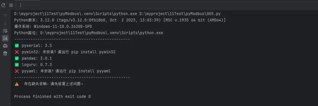 # scripts/check_env.pyimport sysimport importlibimport platformREQUIRED_PACKAGES = {"serial": "pyserial","win32api": "pywin32","pandas": "pandas","loguru": "loguru","yaml": "pyyaml",}defcheck_environment():print(f"Python版本: {sys.version}")print(f"操作系统: {platform.platform()}")print(f"Python路径: {sys.executable}")print("-" * 50) all_ok = Truefor module_name, package_name in REQUIRED_PACKAGES.items():try: mod = importlib.import_module(module_name) version = getattr(mod, "__version__", "版本未知")print(f"✅ {package_name}: {version}")except ImportError:print(f"❌ {package_name}: 未安装!请运行 pip install {package_name}") all_ok = Falseprint("-" * 50)if all_ok:print("🎉 环境检查通过,可以开始开发!")else:print("⚠️ 存在缺失依赖,请先修复上述问题。")return all_okif __name__ == "__main__": check_environment()