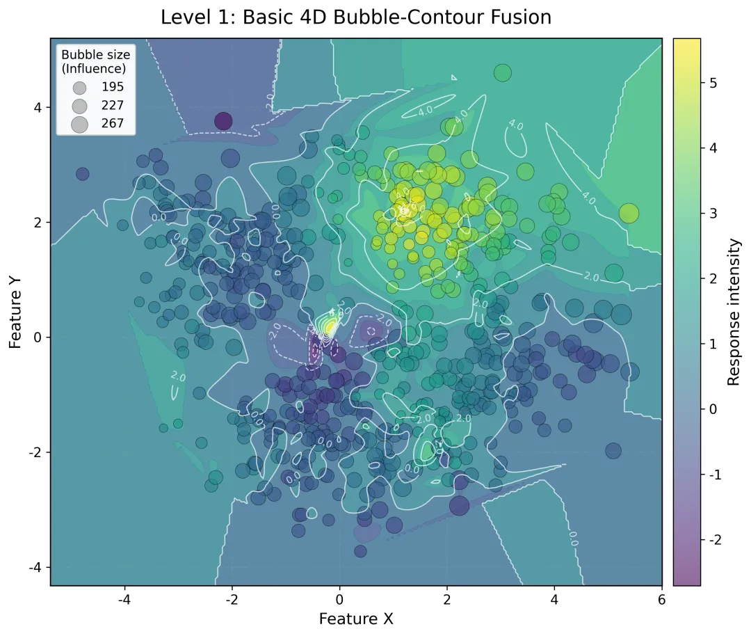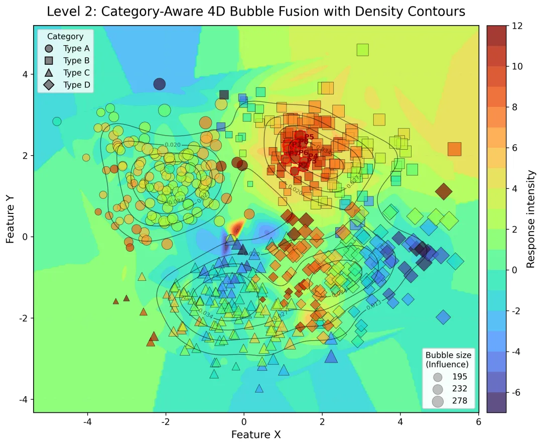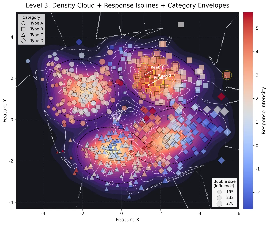 from pathlib import Pathimport numpy as npimport pandas as pdimport matplotlib.pyplot as pltfrom scipy.interpolate import griddatafrom scipy.stats import gaussian_kdefrom matplotlib.lines import Line2Dfrom matplotlib.patches import Ellipse# 1. 全局参数SEED = 2026N_PER_GROUP = 140DPI = 300OUTDIR = Path(__file__).resolve().parent / "output_4d_bubble_contour"OUTDIR.mkdir(parents=True, exist_ok=True)TITLE_FS = 16LABEL_FS = 13TICK_FS = 11LEGEND_FS = 10SCATTER_ALPHA_LV1 = 0.58SCATTER_ALPHA_LV2 = 0.68SCATTER_ALPHA_LV3 = 0.72EDGE_LW = 0.45MARKERS = { "Type A": "o", "Type B": "s", "Type C": "^", "Type D": "D",}# 2. 生成模拟数据def make_data(seed=SEED, n_per_group=N_PER_GROUP): rng = np.random.default_rng(seed) groups = ["Type A", "Type B", "Type C", "Type D"] centers = { "Type A": (-2.2, 1.6), "Type B": ( 1.8, 2.2), "Type C": (-0.3, -1.8), "Type D": ( 2.8, -0.8), } rows = [] for g in groups: cx, cy = centers[g] theta = rng.uniform(0, 2*np.pi, n_per_group) r = np.abs(rng.normal(1.0, 0.55, n_per_group)) x = cx + 1.15 * r * np.cos(theta) + 0.35 * rng.normal(size=n_per_group) y = cy + 0.85 * r * np.sin(theta) + 0.30 * rng.normal(size=n_per_group) x = x + 0.35 * np.sin(1.4 * y) + 0.15 * (x ** 2) / 6 y = y + 0.28 * np.cos(1.3 * x) - 0.06 * (y ** 2) / 7 group_offset = { "Type A": 0.7, "Type B": 1.6, "Type C": -0.9, "Type D": 1.2, }[g] response = ( 1.8 * np.exp(-((x - 1.2) ** 2 + (y - 1.5) ** 2) / 2.0) + 1.3 * np.exp(-((x + 2.0) ** 2 + (y + 1.0) ** 2) / 1.8) + 0.9 * np.sin(1.15 * x) - 0.75 * np.cos(1.35 * y) + 0.22 * x * y + group_offset + rng.normal(0, 0.28, n_per_group) ) influence = ( 65 + 28 * (x - x.min()) + 22 * (y - y.min()) + 85 * np.abs(np.sin(0.8 * x) * np.cos(1.1 * y)) + 35 * rng.random(n_per_group) ) for i in range(n_per_group): rows.append([g, x[i], y[i], response[i], influence[i]]) df = pd.DataFrame(rows, columns=["group", "x", "y", "response", "influence"]) bubble_size = 30 + 260 * (df["influence"] - df["influence"].min()) / ( df["influence"].max() - df["influence"].min() ) df["bubble_size"] = bubble_size return df# 3. 工具函数def make_response_grid(x, y, z, nx=260, ny=240): xi = np.linspace(x.min() - 0.6, x.max() + 0.6, nx) yi = np.linspace(y.min() - 0.6, y.max() + 0.6, ny) X, Y = np.meshgrid(xi, yi) Z = griddata((x, y), z, (X, Y), method="cubic") if np.isnan(Z).sum() > 0: Z_nn = griddata((x, y), z, (X, Y), method="nearest") Z = np.where(np.isnan(Z), Z_nn, Z) return X, Y, Zdef make_density_grid(x, y, nx=260, ny=240, bw=0.24): xi = np.linspace(x.min() - 0.6, x.max() + 0.6, nx) yi = np.linspace(y.min() - 0.6, y.max() + 0.6, ny) X, Y = np.meshgrid(xi, yi) kde = gaussian_kde(np.vstack([x, y]), bw_method=bw) D = kde(np.vstack([X.ravel(), Y.ravel()])).reshape(X.shape) return X, Y, Ddef influence_labels_from_sizes(size_vals, size_min, size_max, infl_min, infl_max): vals = np.interp(size_vals, [size_min, size_max], [infl_min, infl_max]) return [f"{int(v)}" for v in vals]def add_confidence_ellipse(x, y, ax, n_std=1.8, **kwargs): cov = np.cov(x, y) vals, vecs = np.linalg.eigh(cov) order = vals.argsort()[::-1] vals, vecs = vals[order], vecs[:, order] theta = np.degrees(np.arctan2(*vecs[:, 0][::-1])) width, height = 2 * n_std * np.sqrt(vals) mean_x, mean_y = np.mean(x), np.mean(y) ell = Ellipse( (mean_x, mean_y), width=width, height=height, angle=theta, fill=False, **kwargs, ) ax.add_patch(ell)def style_axes(ax): ax.tick_params(labelsize=TICK_FS) ax.grid(alpha=0.12, linestyle="--") for spine in ax.spines.values(): spine.set_linewidth(1.0)# 4. 三张图def plot_level_1(df, Xr, Yr, Zr): fig, ax = plt.subplots(figsize=(9.2, 7.4), dpi=DPI) ax.contourf(Xr, Yr, Zr, levels=14, cmap="viridis", alpha=0.78) cl = ax.contour(Xr, Yr, Zr, levels=10, colors="white", linewidths=0.85, alpha=0.75) ax.clabel(cl, inline=True, fontsize=8, fmt="%.1f") sc = ax.scatter( df["x"], df["y"], s=df["bubble_size"], c=df["response"], cmap="viridis", alpha=SCATTER_ALPHA_LV1, edgecolors="black", linewidths=0.35, ) cbar = fig.colorbar(sc, ax=ax, pad=0.015) cbar.set_label("Response intensity", fontsize=LABEL_FS) cbar.ax.tick_params(labelsize=TICK_FS) size_vals = np.quantile(df["bubble_size"], [0.2, 0.5, 0.85]).round(0) handles = [ plt.scatter([], [], s=v, color="gray", alpha=0.45, edgecolors="black", linewidths=0.4) for v in size_vals ] labels = influence_labels_from_sizes( size_vals, df["bubble_size"].min(), df["bubble_size"].max(), df["influence"].min(), df["influence"].max(), ) leg = ax.legend( handles, labels, title="Bubble size\n(Influence)", loc="upper left", fontsize=LEGEND_FS, title_fontsize=LEGEND_FS, frameon=True, ) ax.add_artist(leg) ax.set_title("Level 1: Basic 4D Bubble-Contour Fusion", fontsize=TITLE_FS, pad=12) ax.set_xlabel("Feature X", fontsize=LABEL_FS) ax.set_ylabel("Feature Y", fontsize=LABEL_FS) style_axes(ax) fig.tight_layout() fig.savefig(OUTDIR / "fig1_basic.png", bbox_inches="tight") plt.close(fig)def plot_level_2(df, Xr, Yr, Zr, Xd, Yd, D): fig, ax = plt.subplots(figsize=(10.0, 7.8), dpi=DPI) cf = ax.contourf(Xr, Yr, Zr, levels=18, cmap="turbo", alpha=0.80) dens_levels = np.quantile(D[D > 0], [0.70, 0.82, 0.90, 0.96]) dens = ax.contour(Xd, Yd, D, levels=dens_levels, colors="k", linewidths=0.85, alpha=0.55) ax.clabel(dens, inline=True, fontsize=7, fmt="%.3f") for g, sub in df.groupby("group"): ax.scatter( sub["x"], sub["y"], s=sub["bubble_size"], c=sub["response"], cmap="turbo", marker=MARKERS[g], alpha=SCATTER_ALPHA_LV2, edgecolors="black", linewidths=EDGE_LW, label=g, ) top = df.nlargest(10, "response").copy() ax.scatter( top["x"], top["y"], s=top["bubble_size"] * 1.25, facecolors="none", edgecolors="red", linewidths=1.0, ) for i, (_, r) in enumerate(top.head(8).iterrows(), 1): ax.text(r["x"] + 0.08, r["y"] + 0.08, f"P{i}", fontsize=9, color="darkred", weight="bold") cbar = fig.colorbar(cf, ax=ax, pad=0.015) cbar.set_label("Response intensity", fontsize=LABEL_FS) cbar.ax.tick_params(labelsize=TICK_FS) cat_handles = [ Line2D([0], [0], marker=MARKERS[g], color="w", label=g, markerfacecolor="gray",