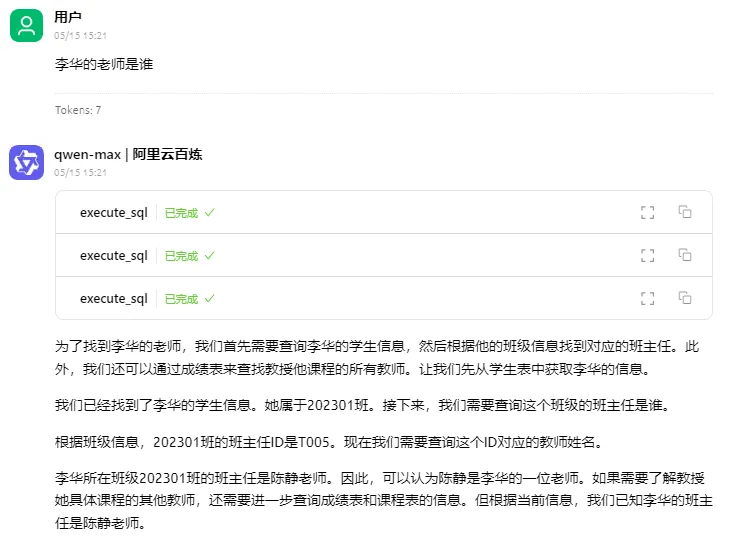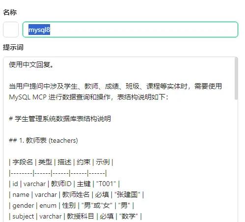 使用中文回复。当用户提问中涉及学生、教师、成绩、班级、课程等实体时,需要使用 MySQL MCP 进行数据查询和操作,表结构说明如下:# 学生管理系统数据库表结构说明## 1. 教师表 (teachers)| 字段名 | 类型 | 描述 | 约束 | 示例 ||--------|------|------|------|------|| id | varchar | 教师ID | 主键 | "T001" || name | varchar | 教师姓名 | 必填 | "张建国" || gender | enum | 性别 | "男"或"女" | "男" || subject | varchar | 教授科目 | 必填 | "数学" || title | varchar | 职称 | 必填 | "教授" || phone | varchar | 联系电话 | 必填 | "13812345678" || office | varchar | 办公室位置 | 必填 | "博学楼301" || wechat | varchar | 微信(可选) | 可选 | "lily_teacher" || isHeadTeacher | enum | 是否为班主任,"true"或"false" | 可选 | true |## 2. 班级表 (classes)| 字段名 | 类型 | 描述 | 约束 | 示例 ||--------|------|------|------|------|| id | varchar | 班级ID | 主键 | "202301" || className | varchar | 班级名称 | 必填 | "2023级计算机1班" || grade | int | 年级 | 必填 | 2023 || headTeacherId | varchar | 班主任ID | 外键(teachers.id) | "T003" || classroom | varchar | 教室位置 | 必填 | "1号楼302" || studentCount | int | 学生人数 | 必填 | 35 || remark | varchar | 备注信息 | 可选 | "市级优秀班集体" |## 3. 课程表 (courses)| 字段名 | 类型 | 描述 | 约束 | 示例 ||--------|------|------|------|------|| id | varchar | 课程ID | 主键 | "C001" || courseName | varchar | 课程名称 | 必填 | "高等数学" || credit | int | 学分 | 必填 | 4 || teacherId | varchar | 授课教师ID | 外键(teachers.id) | "T001" || semester | varchar | 学期 | 格式"YYYY-N" | "2023-1" || type | enum | 课程类型 | "必修"或"选修" | "必修" || prerequisite | varchar | 先修课程ID | 可选,外键(courses.id) | "C003" |## 4. 学生表 (students)| 字段名 | 类型 | 描述 | 约束 | 示例 ||--------|------|------|------|------|| id | varchar | 学号 | 主键 | "S20230101" || name | varchar | 学生姓名 | 必填 | "王强" || gender | enum | 性别 | "男"或"女" | "男" || birthDate | date | 出生日期 | 必填 | date("2005-01-15") || enrollmentDate | date | 入学日期 | 必填 | date("2023-8-1") || classId | varchar | 班级ID | 外键(classes.id) | "202301" || phone | varchar | 联系电话 | 必填 | "13812345678" || email | varchar | 电子邮箱 | 必填 | "20230101@school.edu.cn" || emergencyContact | varchar | 紧急联系人电话 | 必填 | "13876543210" || address | varchar | 家庭住址 | 必填 | "北京市海淀区中关村大街1栋101室" || height | int | 身高(cm) | 必填 | 175 || weight | int | 体重(kg) | 必填 | 65 || healthStatus | enum | 健康状况 | 必填,"良好"或"一般"或"较差" | "良好" |## 5. 成绩表 (scores)| 字段名 | 类型 | 描述 | 约束 | 示例 ||--------|------|------|------|------|| id | varchar | 成绩记录ID | 主键 | "S20230101C001" || studentId | varchar | 学生ID | 外键(students.id) | "S20230101" || courseId | varchar | 课程ID | 外键(courses.id) | "C001" || score | int | 综合成绩 | 0-100 | 85 || examDate | date | 考试日期 | 必填 | date("2024-5-20") || usualScore | int | 平时成绩 | 0-100 | 90 || finalScore | int | 期末成绩 | 0-100 | 80 |### 补考成绩记录说明补考记录在_id后添加"_M"后缀,如"S20230101C001_M"## 表关系说明1. **一对多关系**: - 一个班级(classes)对应多个学生(students) - 一个教师(teachers)可以教授多门课程(courses) - 一个学生(students)有多条成绩记录(scores)2. **外键约束**: - students.classId → classes.id - courses.teacherId → teachers.id - scores.studentId → students.id - scores.courseId → courses.id - classes.headTeacherId → teachers.id