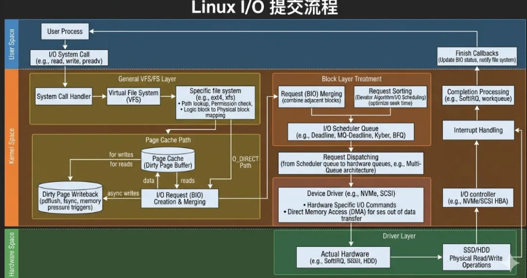 从性能角度总结,I/O 提交流程的优化本质集中在三点:一是通过 page cache 与 writeback 实现批处理与合并,二是通过 blk-mq 提供高并发队列模型,三是通过 DMA 与零拷贝减少 CPU 参与。理解这三点,就抓住了 Linux I/O 性能的核心。