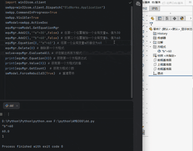 还有一些用得到的命令如GlobalVariable(判断是否是全局变量)、LinkToFile(链接到外部文件)、AutomaticRebuild(是否设置自动重建)等,我们留在下一篇再揭晓吧!import win32com.clientswApp=win32com.client.Dispatch("SldWorks.Application")swApp.CommandInProgress=TrueswApp.Visible=TrueswModel=swApp.ActiveDocequMgr=swModel.GetEquationMgr # 获取方程式管理器equMgr.Add2(0,'"a"=30',False) # 在第一个位置增加一个全局变量a,值为30equMgr.Add2(1,'"b"=60',False) # 在第二个位置增加一个全局变量b,值为60equMgr.Equation(0,'"a"=60') # 将第一个全局变量a的值设为60equMgr.Delete(0) # 删除第一个方程式solve=equMgr.EvaluateAll # 评估解出所有方程式print(equMgr.Equation(0)) # 获取第一个方程表达式print(equMgr.Value(0)) # 获取第一个方程式的值print(equMgr.GetCount) # 获取方程式总数量swModel.ForceRebuild3(True) # 重建零件