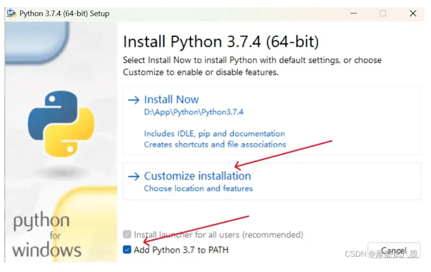 ✅️ 第四步:双击打开安装程序,一定要勾选 “Add Python 3.7 to PATH”(自动配置环境变量,省去手动设置的麻烦,新手千万别漏!),接着点击 “Customize installation”(自定义安装)。