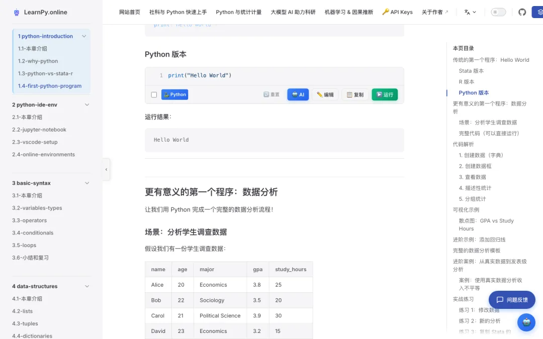 LearnPy.online 是一个专门为社会科学研究者设计的 Python 学习平台。不需要安装任何软件,打开浏览器就能运行代码。