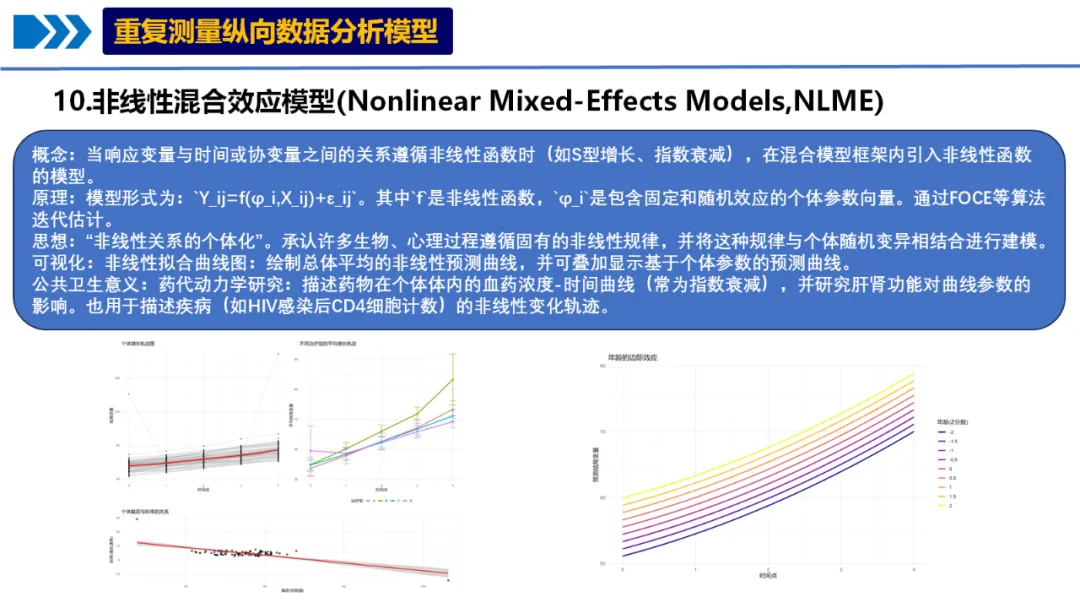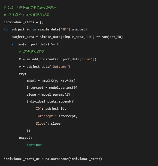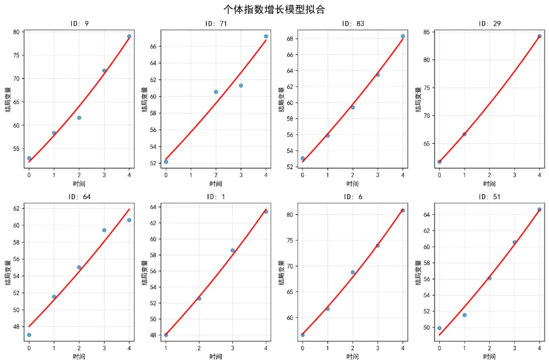 if len(individual_stats_df) > 0: plt.figure(figsize=(10, 8)) plt.scatter(individual_stats_df['Intercept'], individual_stats_df['Slope'], alpha=0.6, s=50)# 添加回归线if len(individual_stats_df) > 1: from scipy.stats import linregress slope, intercept, r_value, p_value, std_err = linregress( individual_stats_df['Intercept'], individual_stats_df['Slope'] ) x_range = np.array([individual_stats_df['Intercept'].min(), individual_stats_df['Intercept'].max()]) plt.plot(x_range, intercept + slope * x_range, color='red', linewidth=2, label=f'回归线 (r={r_value:.3f})') plt.legend() plt.title('个体截距与斜率的关系') plt.xlabel('截距(初始值)') plt.ylabel('斜率(增长速率)') plt.grid(True, alpha=0.3) plt.savefig(fig_dir / '03_截距斜率关系.png', dpi=300, bbox_inches='tight') plt.close()# 2.4 创建合并图fig, axes = plt.subplots(2, 2, figsize=(16, 12))# 子图1: 个体增长轨迹(简化版)for subject_id in simple_data['ID'].unique()[:30]: # 只显示前30个 subject_data = simple_data[simple_data['ID'] == subject_id] axes[0, 0].plot(subject_data['Time'], subject_data['Outcome'], color='gray', alpha=0.3, linewidth=0.5)axes[0, 0].scatter(simple_data['Time'], simple_data['Outcome'], alpha=0.1, s=5, color='blue')axes[0, 0].set_title('个体增长轨迹图')axes[0, 0].set_xlabel('时间点')axes[0, 0].set_ylabel('结局变量')axes[0, 0].grid(True, alpha=0.3)# 子图2: 治疗组平均轨迹for treatment in simple_data['Treatment'].cat.categories: treatment_data = simple_data[simple_data['Treatment'] == treatment] mean_by_time = treatment_data.groupby('Time')['Outcome'].mean() axes[0, 1].plot(mean_by_time.index, mean_by_time.values, label=f'治疗组 {treatment}', linewidth=2, marker='o')axes[0, 1].set_title('不同治疗组的平均增长轨迹')axes[0, 1].set_xlabel('时间点')axes[0, 1].set_ylabel('平均结局变量')axes[0, 1].legend()axes[0, 1].grid(True, alpha=0.3)# 子图3: 截距斜率关系if len(individual_stats_df) > 0: axes[1, 0].scatter(individual_stats_df['Intercept'], individual_stats_df['Slope'], alpha=0.6, s=50) axes[1, 0].set_title('个体截距与斜率的关系') axes[1, 0].set_xlabel('截距(初始值)') axes[1, 0].set_ylabel('斜率(增长速率)') axes[1, 0].grid(True, alpha=0.3)# 子图4: 数据分布axes[1, 1].hist(simple_data['Outcome'], bins=30, edgecolor='black', alpha=0.7)axes[1, 1].set_title('结局变量分布')axes[1, 1].set_xlabel('结局变量值')axes[1, 1].set_ylabel('频数')axes[1, 1].grid(True, alpha=0.3)plt.tight_layout()plt.savefig(fig_dir / '04_探索性数据分析合并图.png', dpi=300, bbox_inches='tight')plt.close()# ==============================# 3. 非线性混合效应模型准备# ==============================print("\n3. 准备非线性混合效应模型数据...")# 复制数据并创建新变量nlme_data = simple_data.copy()# 标准化连续变量scaler_age = StandardScaler()scaler_baseline = StandardScaler()nlme_data['Age_c'] = scaler_age.fit_transform(nlme_data[['Age']])nlme_data['Baseline_c'] = scaler_baseline.fit_transform(nlme_data[['Baseline_Score']])# 确保Treatment是分类变量并设置参考水平nlme_data['Treatment'] = pd.Categorical(nlme_data['Treatment'])nlme_data['Treatment'] = nlme_data['Treatment'].cat.reorder_categories( sorted(nlme_data['Treatment'].cat.categories))# ==============================# 4. 指数增长模型拟合# ==============================print("\n4. 拟合指数增长模型...")def exponential_func(t, A, B):"""指数函数: y = A * exp(B * t)"""return A * np.exp(B * t)# 首先为每个个体拟合单独的指数模型,获取初始参数估计individual_params = []valid_subjects = []for subject_id in nlme_data['ID'].unique(): subject_data = nlme_data[nlme_data['ID'] == subject_id]if len(subject_data) >= 3: # 需要足够的数据点 try:# 初始参数估计 A_init = subject_data['Outcome'].iloc[0] B_init = 0.05# 拟合曲线 params, _ = curve_fit(exponential_func, subject_data['Time'], subject_data['Outcome'], p0=[A_init, B_init], maxfev=10000) individual_params.append({'ID': subject_id,'A': params[0],'B': params[1] }) valid_subjects.append(subject_id) except:continueif len(individual_params) > 0: param_df = pd.DataFrame(individual_params)print(f"成功拟合 {len(param_df)} 个个体的指数模型")# 使用平均参数作为整体模型的初始值 A_init_global = param_df['A'].median() B_init_global = param_df['B'].median()print(f"全局初始参数: A={A_init_global:.2f}, B={B_init_global:.4f}")# 保存个体参数 param_df.to_csv('指数模型个体参数.csv', index=False, encoding='utf-8-sig')# 可视化个体拟合 plt.figure(figsize=(12, 8))# 随机选择几个个体显示 np.random.seed(123) sample_ids = np.random.choice(valid_subjects, min(8, len(valid_subjects)), replace=False)for i, subject_id in enumerate(sample_ids): subject_data = nlme_data[nlme_data['ID'] == subject_id] subject_param = param_df[param_df['ID'] == subject_id].iloc[0]# 生成平滑曲线 t_smooth = np.linspace(subject_data['Time'].min(), subject_data['Time'].max(), 100) y_smooth = exponential_func(t_smooth, subject_param['A'], subject_param['B']) plt.subplot(2, 4, i + 1) plt.scatter(subject_data['Time'], subject_data['Outcome'], alpha=0.7, s=30) plt.plot(t_smooth, y_smooth, 'r-', linewidth=2) plt.title(f'ID: {subject_id}') plt.xlabel('时间') plt.ylabel('结局变量') plt.grid(True, alpha=0.3) plt.suptitle('个体指数增长模型拟合', fontsize=16) plt.tight_layout() plt.savefig(fig_dir / '05_个体指数模型拟合.png', dpi=300, bbox_inches='tight') plt.close()# 整体数据拟合(不考虑随机效应) try: all_times = nlme_data['Time'].values all_outcomes = nlme_data['Outcome'].values popt, pcov = curve_fit(exponential_func, all_times, all_outcomes, p0=[A_init_global, B_init_global], maxfev=10000)print(f"整体指数模型参数: A={popt[0]:.2f}, B={popt[1]:.4f}")# 可视化整体拟合 plt.figure(figsize=(10, 6)) plt.scatter(all_times, all_outcomes, alpha=0.1, s=10, label='原始数据'