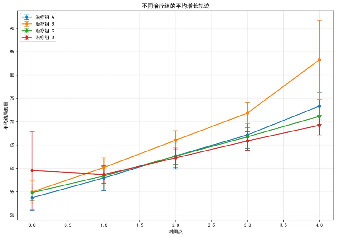 # pip install pandas numpy matplotlib seaborn scipy statsmodels scikit-learn python-docximport osimport warningsimport numpy as npimport pandas as pdimport matplotlib.pyplot as pltimport seaborn as snsfrom scipy import statsfrom scipy.optimize import curve_fitimport statsmodels.api as smimport statsmodels.formula.api as smffrom statsmodels.tools.tools import add_constantfrom sklearn.preprocessing import StandardScalerfrom datetime import datetimeimport jsonfrom pathlib import Pathfrom docx import Documentfrom docx.shared import Inchesfrom docx.enum.text import WD_ALIGN_PARAGRAPHfrom docx.enum.table import WD_TABLE_ALIGNMENTimport matplotlibmatplotlib.use('Agg') # 非交互式后端# 设置中文显示plt.rcParams['font.sans-serif'] = ['SimHei', 'DejaVu Sans']plt.rcParams['axes.unicode_minus'] = False# 忽略警告warnings.filterwarnings('ignore')# ==============================# 0. 设置工作目录和结果文件夹# ==============================# 自动寻找桌面路径desktop_path = Path.home() / 'Desktop'os.chdir(desktop_path)# 创建结果文件夹results_dir = desktop_path / '10-NLME结果'results_dir.mkdir(exist_ok=True)os.chdir(results_dir)# ==============================# 1. 数据读取与预处理# ==============================print("1. 数据读取与预处理...")# 读取Excel数据try: data_file = desktop_path / 'longitudinal_data.xlsx' simple_data = pd.read_excel(data_file, sheet_name='Simple_Dataset')except FileNotFoundError:print(f"错误: 未找到文件 {data_file}")print("创建示例数据以供演示...")# 创建示例数据 np.random.seed(123) n_subjects = 100 n_timepoints = 5 subjects = []times = [] outcomes = [] treatments = [] ages = [] baselines = [] sexes = [] schools = [] dates = [] treatments_list = ['A', 'B', 'C', 'D']for i in range(n_subjects): subject_id = f"SUB{i + 1:03d}" treatment = np.random.choice(treatments_list) age = np.random.normal(45, 10) baseline = np.random.normal(50, 10) sex = np.random.choice(['M', 'F']) school = f"SCH{np.random.randint(1, 6)}"# 指数增长轨迹 time_points = np.arange(n_timepoints) base_outcome = baseline * np.exp(0.05 * time_points)# 添加随机效应 random_effect = np.random.normal(0, 5)# 添加治疗效应if treatment == 'B': treatment_effect = 5elif treatment == 'C': treatment_effect = 10elif treatment == 'D': treatment_effect = 15else: treatment_effect = 0 outcome = base_outcome + random_effect + treatment_effect + np.random.normal(0, 2, n_timepoints)# 添加到列表 subjects.extend([subject_id] * n_timepoints) times.extend(time_points) outcomes.extend(outcome) treatments.extend([treatment] * n_timepoints) ages.extend([age] * n_timepoints) baselines.extend([baseline] * n_timepoints) sexes.extend([sex] * n_timepoints) schools.extend([school] * n_timepoints) dates.extend([datetime(2023, 1, 1) + pd.Timedelta(days=t * 30) for t in time_points]) simple_data = pd.DataFrame({'ID': subjects,'Time': times,'Outcome': outcomes,'Treatment': treatments,'Age': ages,'Baseline_Score': baselines,'Sex': sexes,'School_ID': schools,'Measurement_Date': dates })# 保存示例数据 simple_data.to_excel(data_file, sheet_name='Simple_Dataset', index=False)print(f"已创建示例数据并保存到: {data_file}")# 数据清洗和转换simple_data['ID'] = simple_data['ID'].astype('category')simple_data['Time'] = pd.to_numeric(simple_data['Time'], errors='coerce')simple_data['Age'] = pd.to_numeric(simple_data['Age'], errors='coerce')simple_data['Sex'] = simple_data['Sex'].astype('category')simple_data['Treatment'] = simple_data['Treatment'].astype('category')simple_data['Baseline_Score'] = pd.to_numeric(simple_data['Baseline_Score'], errors='coerce')simple_data['School_ID'] = simple_data['School_ID'].astype('category')if'Measurement_Date'in simple_data.columns: simple_data['Measurement_Date'] = pd.to_datetime(simple_data['Measurement_Date'], errors='coerce')simple_data['Outcome'] = pd.to_numeric(simple_data['Outcome'], errors='coerce')# 删除完全缺失Outcome的行simple_data = simple_data.dropna(subset=['Outcome'])# 查看数据结构print("\n数据集结构:")print(f"行数: {simple_data.shape[0]}, 列数: {simple_data.shape[1]}")print("\n数据摘要:")print(simple_data.describe())print("\n数据类型:")print(simple_data.dtypes)# 保存清洗后的数据simple_data.to_csv('清洗后数据.csv', index=False, encoding='utf-8-sig')# ==============================# 2. 探索性数据分析# ==============================print("\n2. 探索性数据分析...")# 创建图形文件夹fig_dir = results_dir / 'figures'fig_dir.mkdir(exist_ok=True)# 2.1 个体增长轨迹plt.figure(figsize=(12, 8))for subject_id in simple_data['ID'].unique()[:50]: # 只显示前50个个体避免过度拥挤 subject_data = simple_data[simple_data['ID'] == subject_id] plt.plot(subject_data['Time'], subject_data['Outcome'], color='gray', alpha=0.3, linewidth=0.5)# 添加平滑曲线from scipy.interpolate import make_interp_splinetry: time_sorted = simple_data['Time'].sort_values().unique() mean_outcome_by_time = simple_data.groupby('Time')['Outcome'].mean().reindex(time_sorted)# 使用样条插值获得平滑曲线if len(time_sorted) > 3: x_smooth = np.linspace(time_sorted.min(), time_sorted.max(), 300) spl = make_interp_spline(time_sorted, mean_outcome_by_time.values, k=3) y_smooth = spl(x_smooth) plt.plot(x_smooth, y_smooth, color='red', linewidth=2, label='平均趋势')except Exception as e:print(f"平滑曲线绘制失败: {e}")plt.scatter(simple_data['Time'], simple_data['Outcome'], alpha=0.2, s=10, color='blue')plt.title('个体增长轨迹图')plt.xlabel('时间点')plt.ylabel('结局变量')plt.grid(True, alpha=0.3)plt.savefig(fig_dir / '01_个体增长轨迹.png', dpi=300, bbox_inches='tight')plt.close()# 2.2 按治疗组分组的平均轨迹plt.figure(figsize=(12, 8))for treatment in simple_data['Treatment'].cat.categories: treatment_data = simple_data[simple_data['Treatment'] == treatment] mean_by_time = treatment_data.groupby('Time')['Outcome'].agg