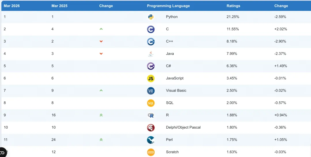 闲来无事,当我再次打开 TIOBE 编程社区指数时,虽然预料到 AI 浪潮会对生态产生冲击,但数据给出的答案依然令人心惊: