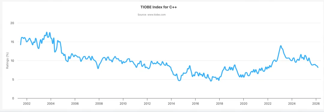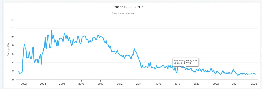然而,拉开最近二十年的 TIOBE 指数趋势图,你会发现一个残酷的事实: