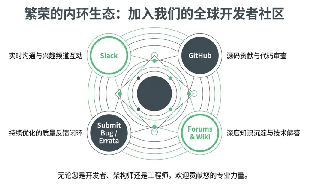 用户可以通过Wiki、论坛和微信,QQ 即时聊天工具平台等多种渠道参与社区互动,共同推动技术的演进。