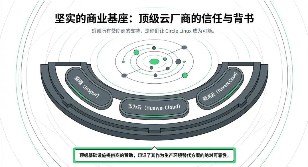 Circle Linux 的发展得到了包括浪潮、华为云和腾讯云在内的多家知名企业的赞助支持。作为一个开放的协作平台,它鼓励开发者和工程师通过Slack或GitHub贡献力量,共同打造可靠的系统环境。