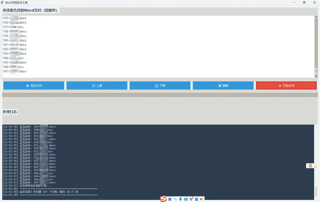 解读: 如果不使用多线程,当点击“开始合并”后,程序会卡死,窗口变成“未响应”状态,体验极差。我们在这里创建了一个新的守护线程(daemon=True)来处理耗时的文档合并操作。这样,主线程(UI线程)依然可以响应鼠标移动、更新进度条,用户界面始终保持流畅。