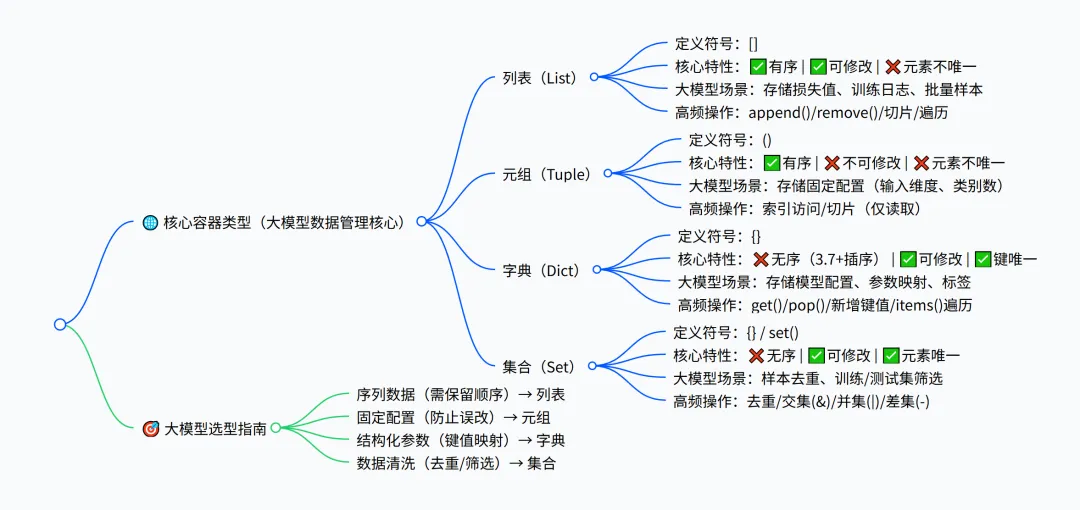 今天我们掌握了 4 种核心容器数据类型,能高效管理大模型的配置、数据和训练日志。下一篇将讲解函数与模块:把重复的数据处理、模型训练逻辑封装成函数,再打包成模块,让代码更简洁、可复用,这是大模型工程化开发的关键一步!