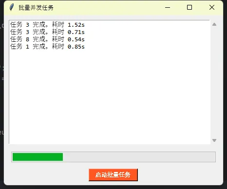 import tkinter as tkfrom tkinter import ttk, scrolledtextimport threadingimport queueimport timefrom concurrent.futures import ThreadPoolExecutor, as_completedclassBatchApp:def__init__(self, root):self.root = rootself.root.title("批量并发任务")self.root.geometry("450x350")self.log = scrolledtext.ScrolledText(root, height=12, font=("Consolas", 10))self.log.pack(padx=10, pady=10, fill="both", expand=True)self.progress = ttk.Progressbar(root, length=420, mode="determinate")self.progress.pack(pady=5) tk.Button(root, text="启动批量任务", command=self.start_batch, bg="#FF5722", fg="white", padx=10).pack(pady=8)self.msg_queue = queue.Queue()self.root.after(100, self.check_queue)defsimulate_task(self, task_id):"""模拟单个任务(子线程执行)"""import random duration = random.uniform(0.5, 2.0) time.sleep(duration)return task_id, durationdefrun_batch(self):"""在独立线程中管理线程池""" tasks = list(range(1, 9)) # 8个任务 completed = 0with ThreadPoolExecutor(max_workers=4) as executor: futures = {executor.submit(self.simulate_task, tid): tidfor tid in tasks}for future in as_completed(futures): task_id, duration = future.result() completed += 1self.msg_queue.put(("log", f"任务 {task_id} 完成,耗时 {duration:.2f}s"))self.msg_queue.put(("progress", completed / len(tasks) * 100))self.msg_queue.put(("done", f"全部 {len(tasks)} 个任务已完成!"))defstart_batch(self):self.progress["value"] = 0self.log.delete(1.0, tk.END) threading.Thread(target=self.run_batch, daemon=True).start()defcheck_queue(self):try:whileTrue: msg_type, value = self.msg_queue.get_nowait()if msg_type == "log":self.log.insert(tk.END, value + "\n")self.log.see(tk.END)elif msg_type == "progress":self.progress["value"] = valueelif msg_type == "done":self.log.insert(tk.END, f"\n✅ {value}\n")except queue.Empty:passself.root.after(100, self.check_queue)if __name__ == "__main__": root = tk.Tk() app = BatchApp(root) root.mainloop()