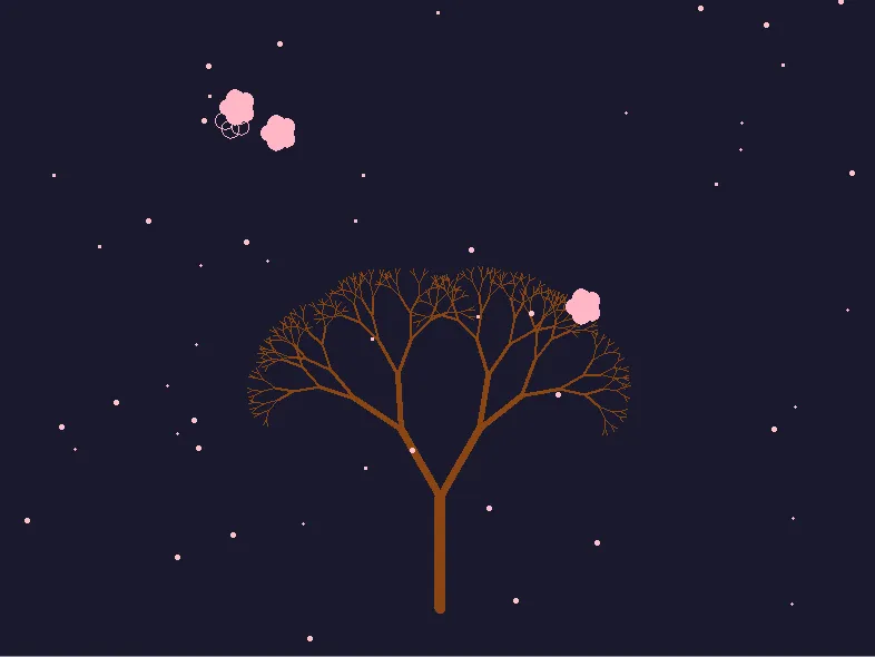 花瓣随风飘落,树枝轻轻摇曳,像不像宫崎骏动画里的场景?(一定要自己运行一下代码,亲自看一下动态生成过程)