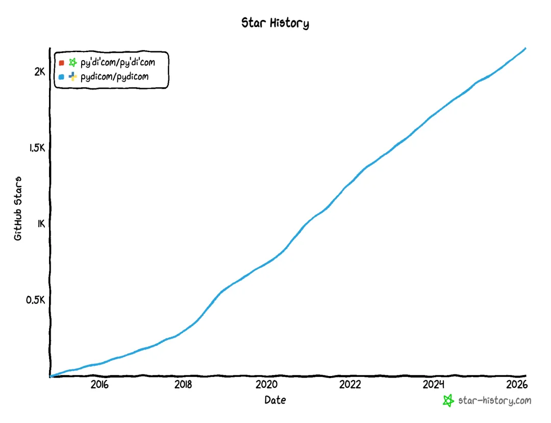 pydicom是一个Python编写的开源库,专门用于处理DICOM 文件,而且DICOM 对许多不同类型的数据集进行了标准化定义。它由Darcy Mason创建并维护,至今已在GitHub上积累了超过1300次提交,成为医学影像处理领域最受欢迎的工具之一。pydicom的核心设计理念是"Pythonic"——用最符合Python习惯的方式,让复杂的DICOM操作变得简单直观。无论你是医学影像的研究者、PACS系统开发者,还是AI医疗应用的工程师,pydicom都能帮你轻松搞定DICOM数据的读取、修改和写入。