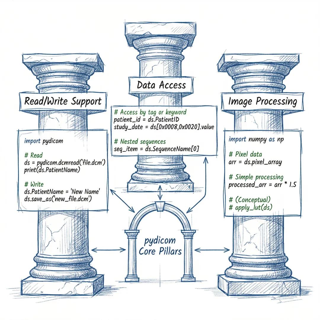🔬 在医学影像领域,医学数字成像和通信(DICOM)标准是当之无愧的"通用语言"。而pydicom,就是这把语言的最佳翻译官。作为Python生态中最受欢迎的DICOM处理库,pydicom以其简洁的API和强大的功能,让开发者能够以"Pythonic"的方式轻松读取、修改和写入DICOM数据。今天,我们就来深入探索pydicom的设计理念与最佳实践!