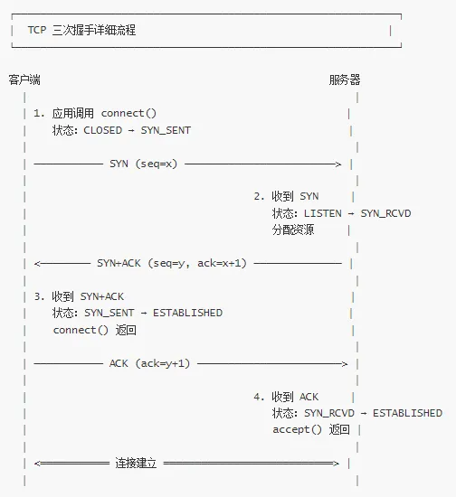 客户端:connect() → SYN_SENT → ESTABLISHED