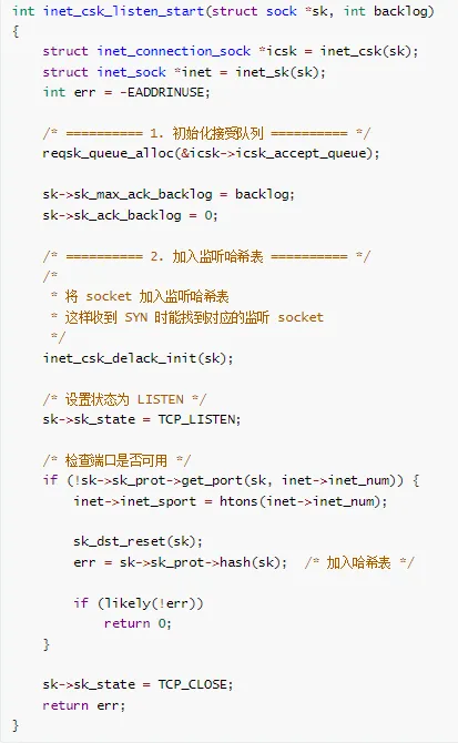 * inet_csk_listen_start - 开始监听