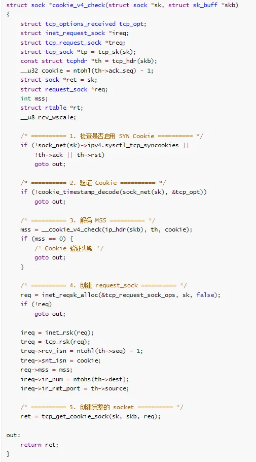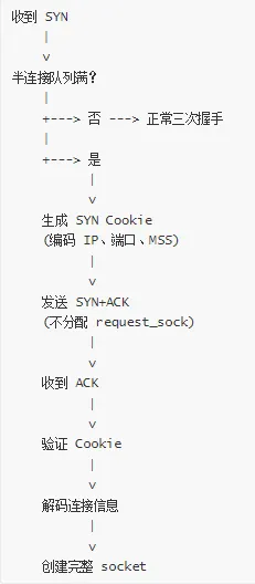 SYN Cookie 检查:如果半连接队列满了,启用 SYN Cookie 机制