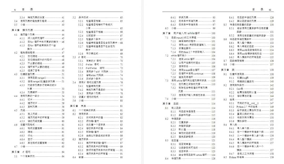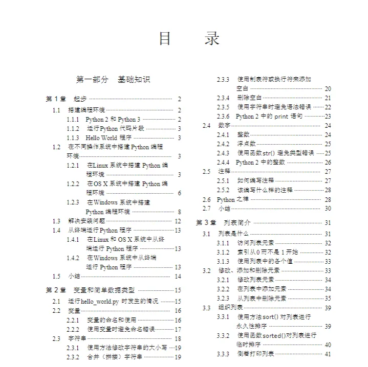 第1章 起步 第2章 变量和简单数据类型 第3章 列表简介 第4章 操作列表 第5章 if语句 第6章 字典 第7章 用户输入和while循环 第8章 函数 第9章 类 第10章 文件和异常 第11章 测试代码