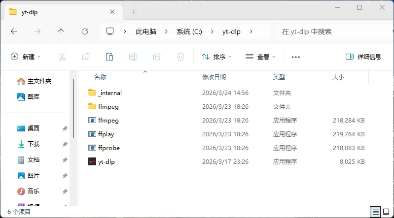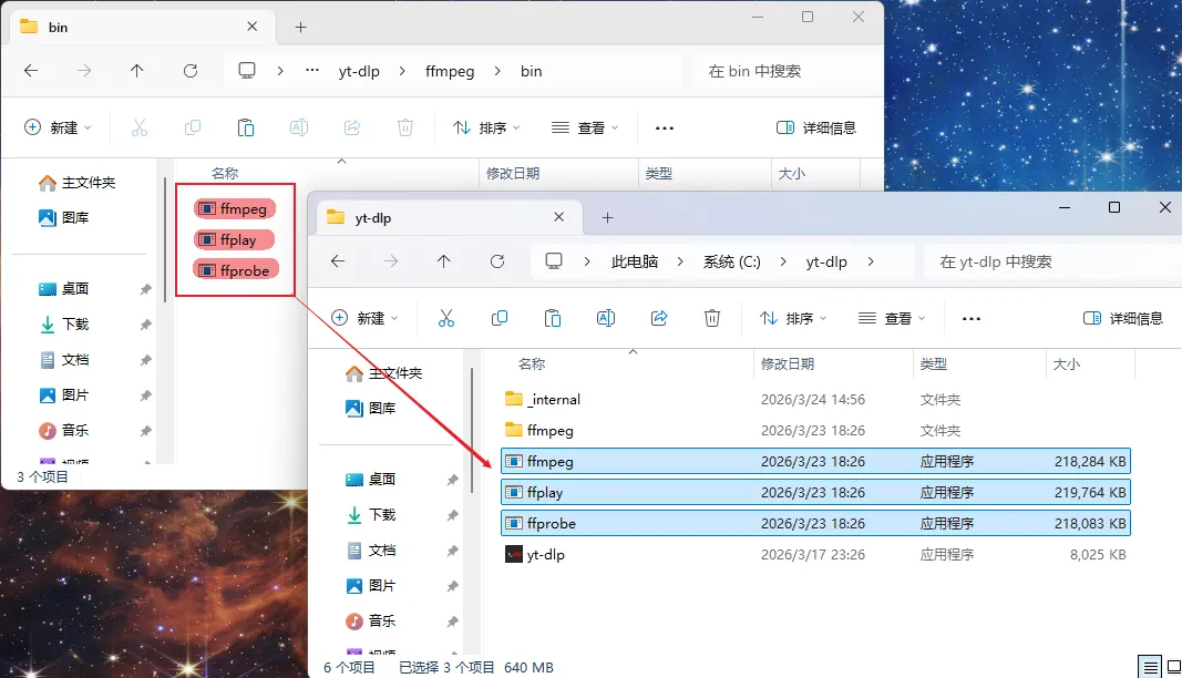 - • 进入 .\ffmpeg\bin\ 目录,剪切 ffmpeg.exe,ffplay.exe,ffprobe.exe 这三个文件并粘贴到 yt-dlp.exe 的同级文件夹下。