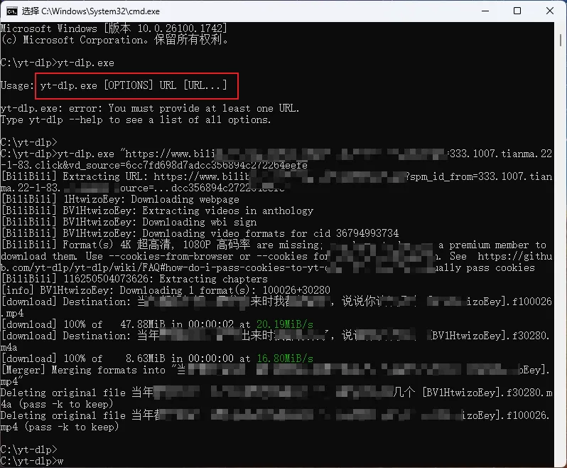 - 2. 输入 yt-dlp “URL…”,回车,愉快下载,下载完毕文件保存在当前文件夹下。