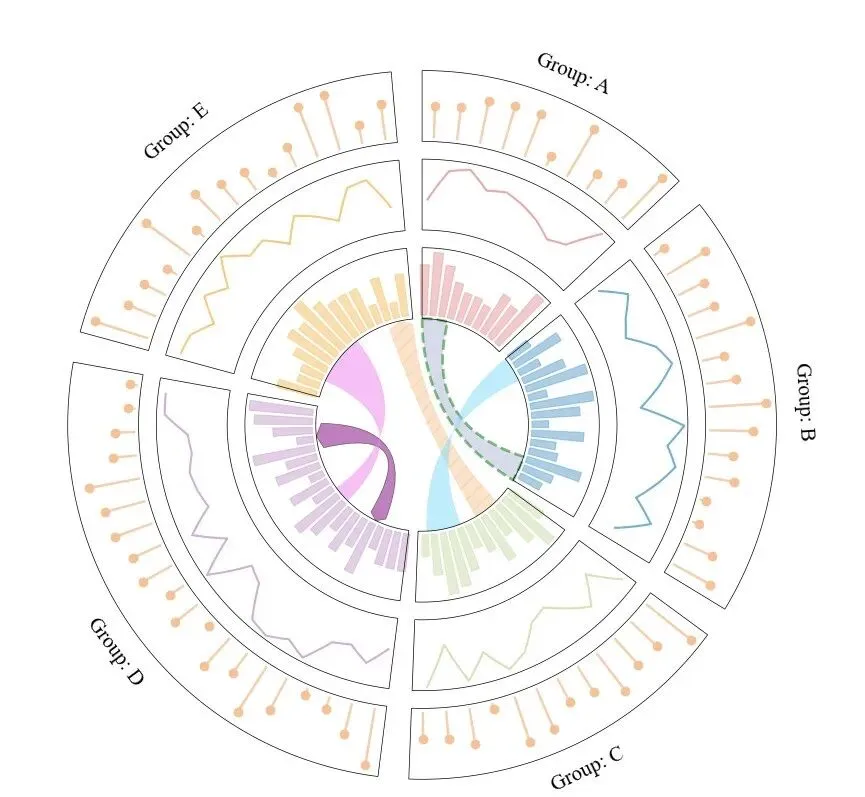本期分享基于Circos绘制切尔斯图,这个图主要用于综合展示不同分组(sector)中多维数据的分布特征及其相互关联关系。
