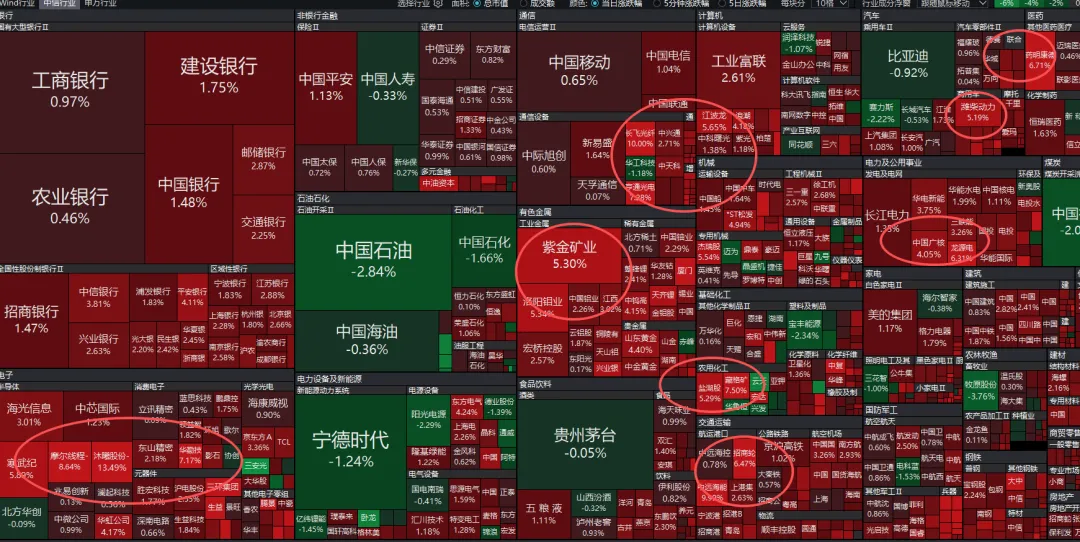 领涨个股有药明康德,沐曦股份,长城军工,寒武纪,南亚新材,联瑞新材,瑞联新材,大族数控,亚翔集成,德明利,紫金矿业,融捷股份,天齐锂业,永兴材料,招商轮船长飞光纤,亨通光电等。